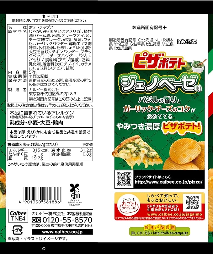 Pommes de terre (Japon ou Américaine), huiles végétales (huile de palme, huile de riz, huile d'olive), flocons de fromage, sucre, sel, amidon, poudre d'ail, assaisonnement à l'extrait de levure, sauce soja en poudre (y compris blé et soja), poudre de poulet, poivre noir, poudre de fromage, basilic, persil / assaisonnement (glutamate monosodique, etc.), arôme, émulsifiant, colorant (caroténoïde (caramel). Édulcorant (Stevia, réglisse.)