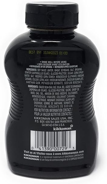 SAUCE SOJA (EAU, BLÉ, FÈVES DE SOJA, SEL), SIROP DE MAÏS À TENEUR ÉLEVÉE EN FRUCTOSE, SUCRE, SIROP DE MAÏS, EAU, SEL, AMIDON DE MAÏS MODIFIÉ, GLUTAMATE MONOSODIQUE, VINAIGRE, COLORANT CARAMEL, ACIDE CITRIQUE, INOSINATE DISODIQUE, GUANYLATE DISODIQUE, GOMME XANTHANE, MOINS DE 0,1% DE SORBATE DE POTASSIUM ET DE BENZOATE DE SODIUM COMME CONSERVATEURS.