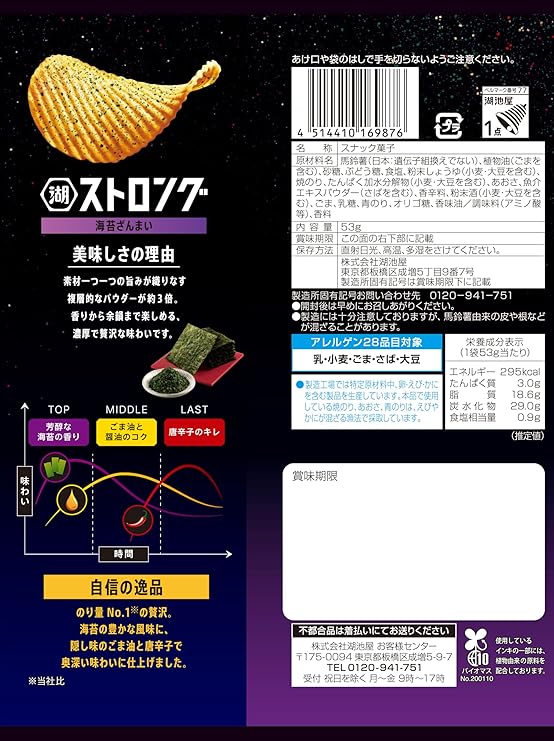 Pommes de terre (Japon : non génétiquement modifiées), huile végétale (contient du sésame), sucre, glucose, sel, sauce soja en poudre (contient du blé et du soja), algues grillées, hydrolysat de protéines (contient du blé et du soja), algues vertes, poudre d'extrait de fruits de mer (contient du maquereau), épices, saké en poudre (contient du blé et du soja), sésame, lactose, algues vertes, oligosaccharides, huile aromatisante/assaisonnement (glutamate monosodique, etc.), arômes