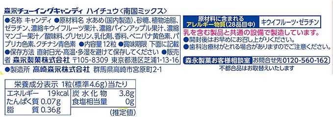 Sirop d'amidon (fabriqué au Japon), sucre, graisses et huiles végétales, gélatine, jus de kiwi concentré, jus d'ananas concentré, jus de mangue concentré, acidulant, glycérine, émulsifiant, arôme, pigment jaune de carthame, colorant paprika, pigment bleu de gardénia