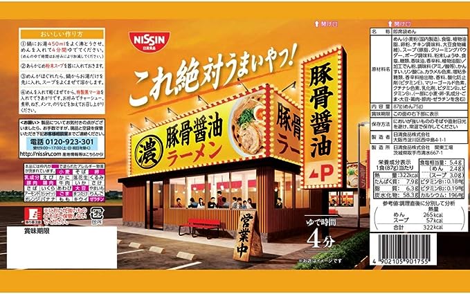 Nouilles (farine de blé (produite au Japon), sel, huile végétale, poudre d'œuf, assaisonnement pour poulet, fibres alimentaires de soja), soupe (miso, sauce soja, saindoux, extrait de porc, sucres, épices (ail, gingembre, poivre), sel , huile végétale, extrait de levure, huile aromatisante) / amidon modifié, assaisonnement (acides aminés, etc.), eau salée, phosphate de calcium, pigment caramel, parfum, extrait d'épice, pigment caroténoïde, antioxydant (vitamine E), émulsifiant, vitamine B2 , Vitamine B1
