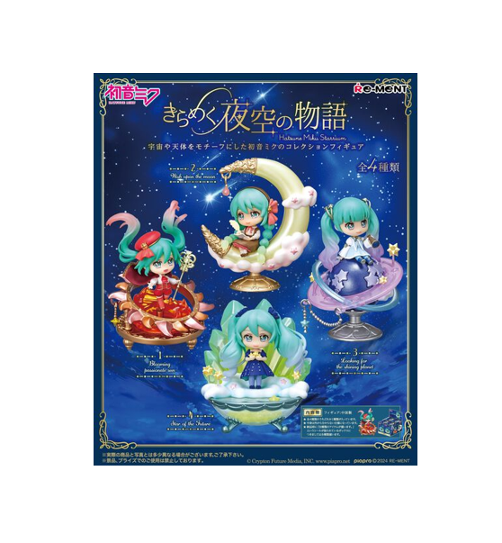 Collectionnez les 4 Re-Ment Hatsune Miku Starrium . Ce sont des boîtes mystères ; si vous achetez une seule boîte, elle sera tirée au sort. Si vous avez acheté l'ensemble complet, vous pourrez collectionner les 4 types de Re-Ment Hatsune Miku Starrium.