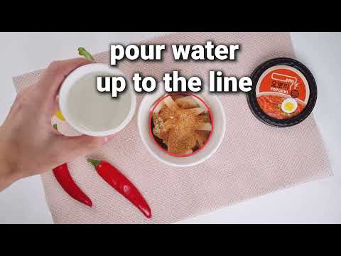 1. Après avoir ouvert le couvercle du récipient, mettez les galettes de riz, les nouilles et la soupe en poudre dans une tasse et remplissez-la d'eau jusqu'à la ligne de référence.