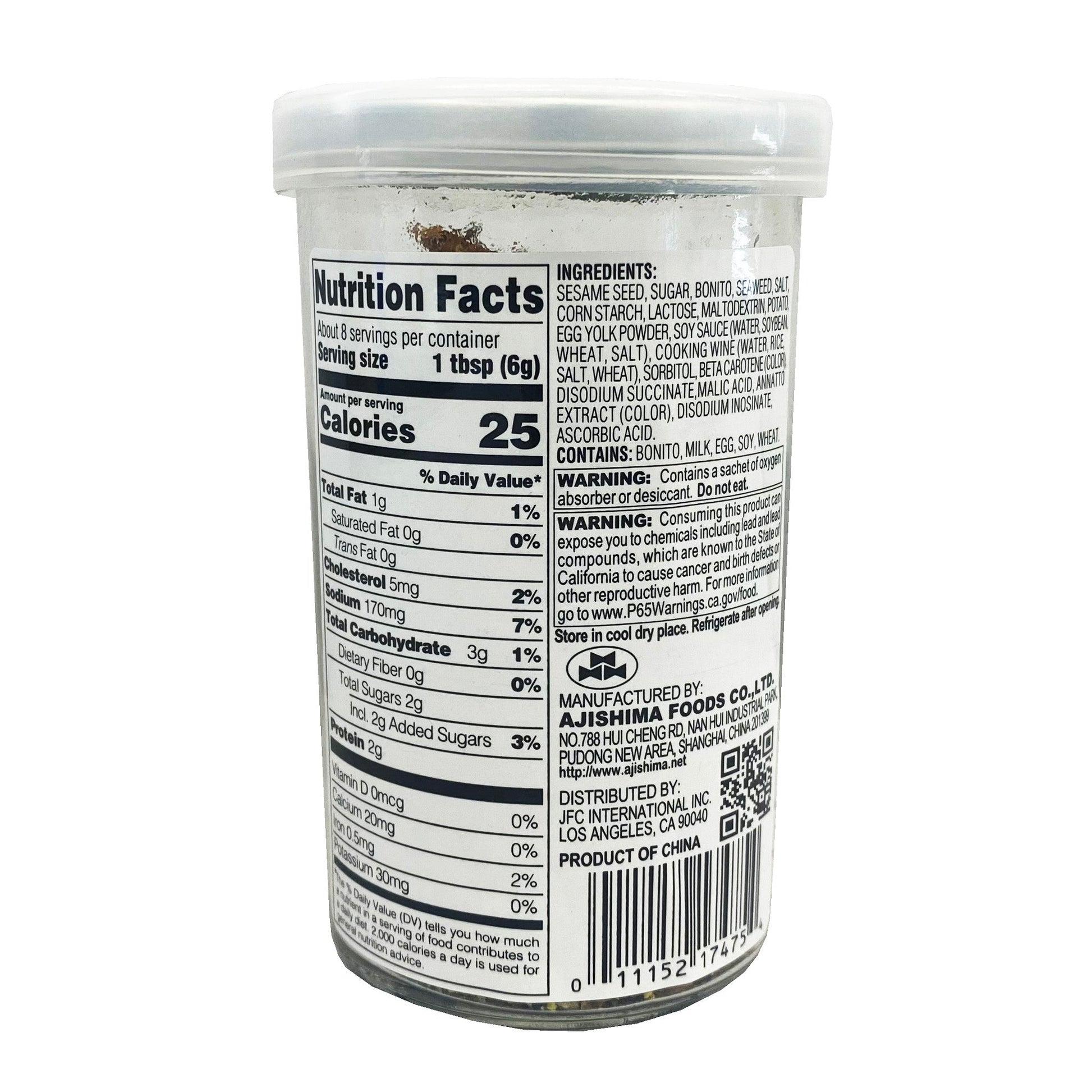 ごま、砂糖、かつお、海苔、食塩、コーンスターチ、乳糖、マルトデキストリン、じゃがいも、卵黄粉末、しょうゆ(水、大豆、小麦、食塩)、料理酒(米、水、食塩、小麦)、ソルビトール( 100g あたりソルビトール 0.2g)、ベータカロテン(色素)、コハク酸二ナトリウム、リンゴ酸、アナトーエキス(色素)、イノシン酸二ナトリウム、アスコルビン酸。