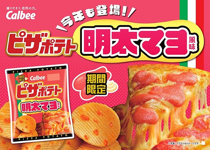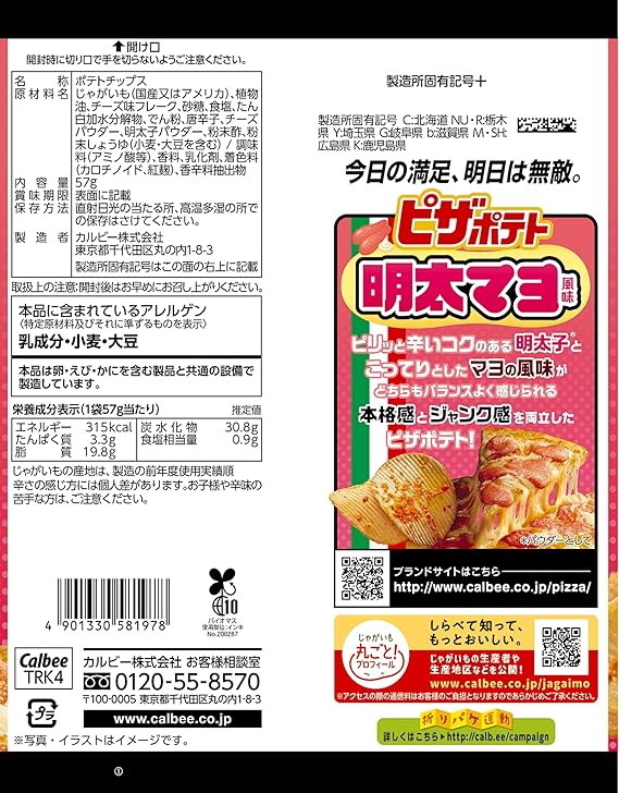 じゃがいも(国産またはアメリカ産)、植物油脂、チーズ風味フレーク、砂糖、食塩、たん白加水分解物、でん粉、唐辛子、チーズパウダー、明太子パウダー、粉末酢、粉末醤油(小麦・大豆を含む)/調味料(グルタミン酸ナトリウム等)、香料、乳化剤、着色料(カロテノイド、紅麹)、香辛料抽出物