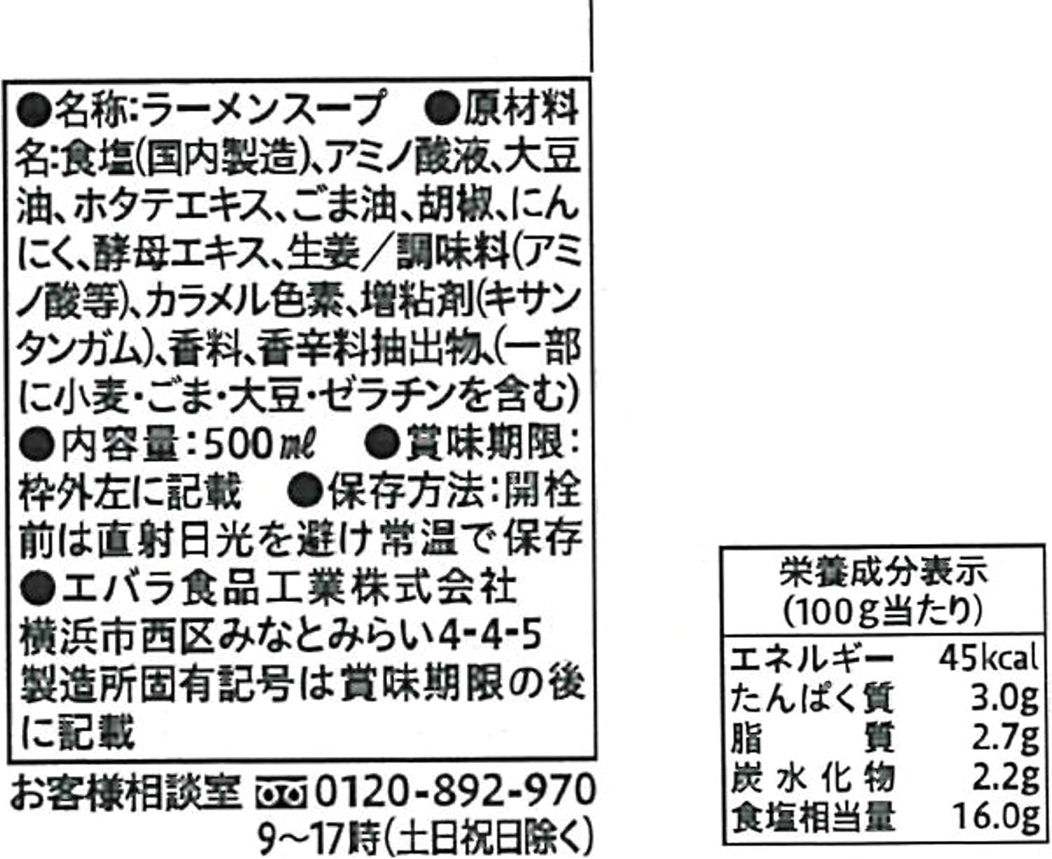 Salt (produced in Japan), amino acid liquid, soybean oil, scallop extract, sesame oil, pepper, garlic, yeast extract, ginger/seasoning (amino acids, etc.), caramel color, thickener (xanthan gum), flavoring, spice extract