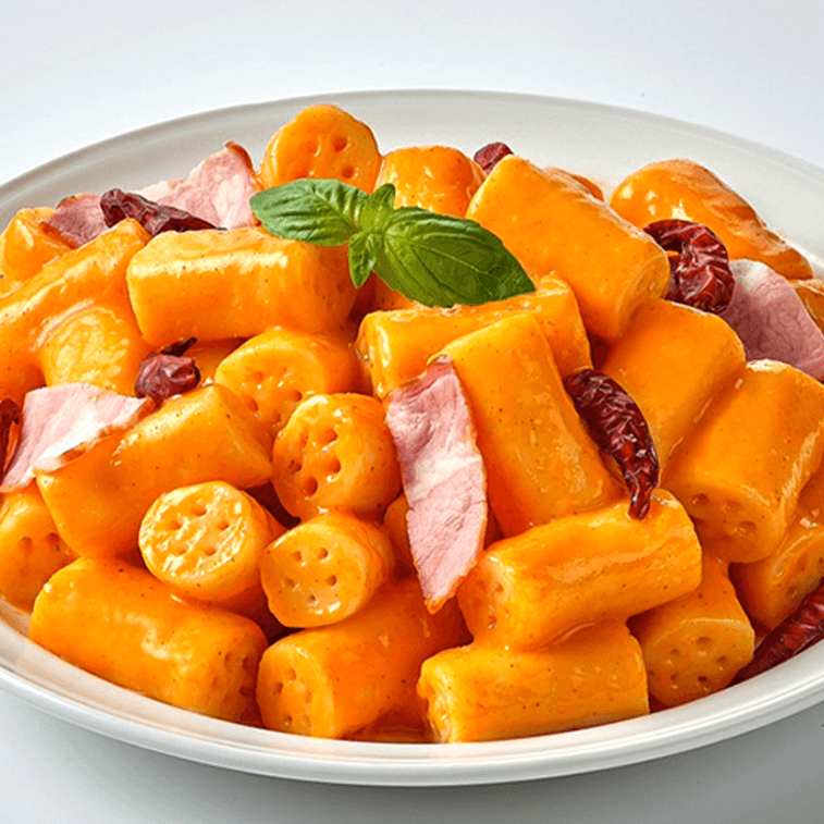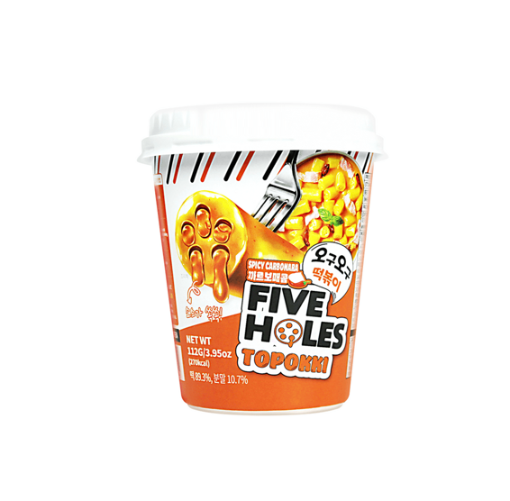 電子レンジでチンするだけで手軽に食べられる、カップ型のインスタントトッポッキです。一口食べると、トッポッキの5つの穴から、スパイシーなカルボナーラがとろりと出てきます。