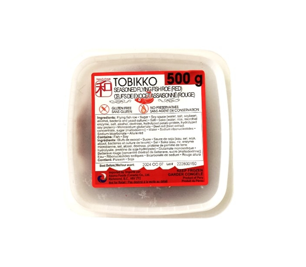 トビウオの卵、砂糖、醤油(水、食塩、大豆、エタノール、細菌および酵母培養物)、食塩、酒(水、米、微生物酵素、食塩、エタノール、ブドウ糖、加水分解馬鈴薯タンパク質、加水分解大豆タンパク質)、グルタミン酸ナトリウム、ビートレッド[ビートエキス濃縮物、糖類(マルトデキストリン)]、水、リボヌクレオチドナトリウム、炭酸水素ナトリウム、アルーラレッド。
