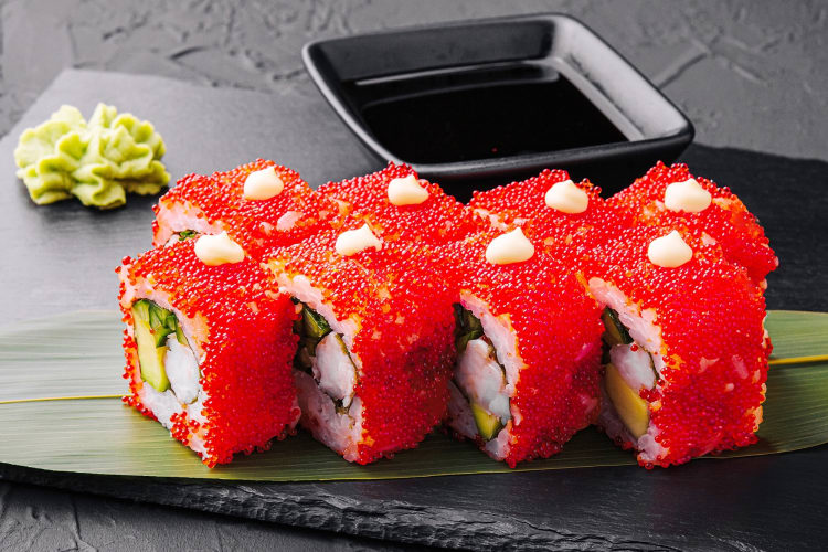 赤いとびっこは、寿司によく使われる味付けされたトビウオの卵巣です。