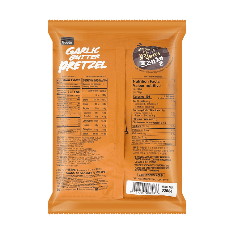プレッツェル(小麦、パーム油、食塩、砂糖、イースト)、パームオレイン油、ガーリックバターシーズニング(砂糖、ホエイパウダー、食塩、ガーリックパウダー、トーストガーリックパウダー)、はちみつ。