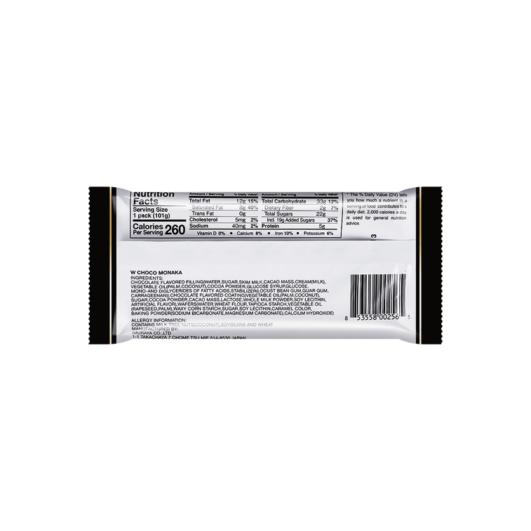 チョコレート風味のファイリング(水、砂糖、スキムミルク、カカオマス、クリーム(牛乳)、植物油(パーム、ココナッツ)、ココアパウダー、グルコースシロップ、ブドウ糖、脂肪酸のモノグリセリドおよびジグリセリド、安定剤(ローカストビーンガム、グアー)ガム、カラギナン))、チョコレート風味コーティング(植物油(パーム、ココナッツ)、砂糖、ココアパウダー、カカオマス、乳糖、全粉乳、大豆レシチン、人工香料)、ウエハース(水、小麦粉、タピオカデンプン、野菜)油、菜種、パーム)、ワキシーコーンスターチ、砂糖、大豆レシチン、カラメル色素、ベーキングパウダー(重炭酸ナトリウム、炭酸マグネシウム)、水酸化カルシウム)