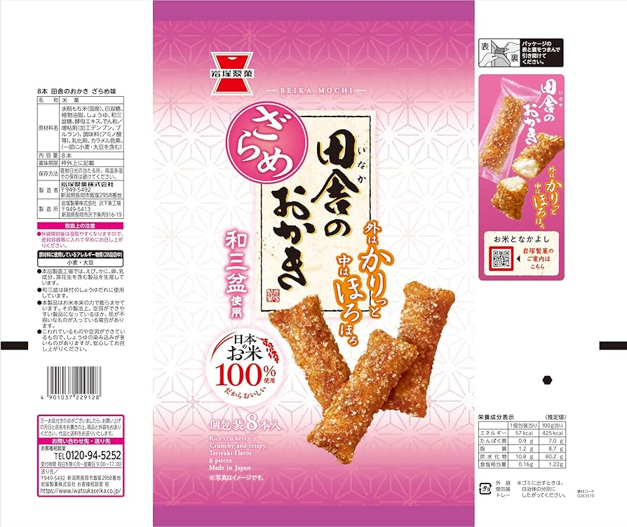 もち米(国産)、白砂糖、植物油脂、醤油、和三盆糖、酵母エキス、澱粉/増粘剤(加工澱粉、プルラン)、調味料(グルタミン酸ナトリウム等)、乳化剤、カラメル色素
