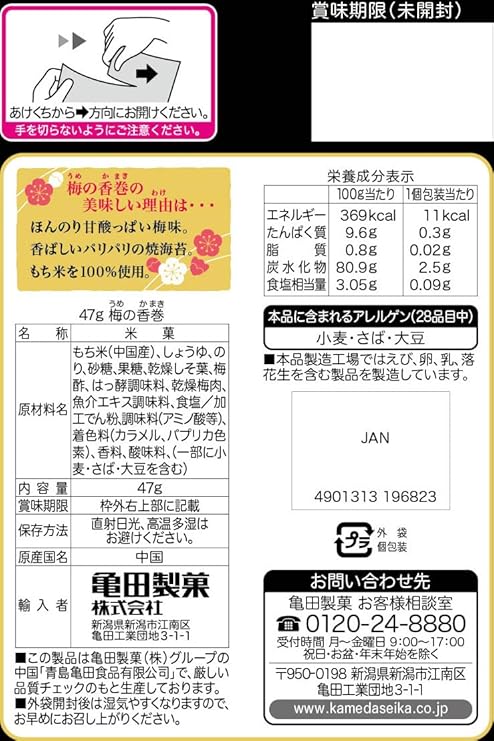 もち米(中国産)、醤油、海藻、砂糖、果糖、しそ、梅酢、発酵調味料、梅肉、魚介エキス調味料、食塩、加工デンプン、調味料(グルタミン酸ナトリウム等)、着色料(カラメル、パプリカ色素)、香料、酸味料