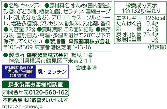水飴(国内製造)、砂糖、ブドウ糖、植物油脂、ゼラチン、濃縮ヨーグルト(乳成分を含む)、アロエエキス/ソルビトール、増粘多糖類、グリセリン、酸味料、乳化剤、香料