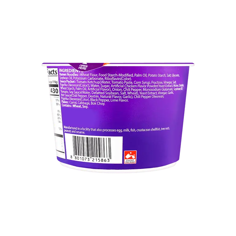 スープ (26.4%): トマトケチャップ(大豆)、水、白砂糖、風味増強剤[L-グルタミン酸ナトリウム(E621)]、人工チキンフレーバー(小麦、大豆)、玉ねぎ、チリペッパーパウダー(大豆)、人工チキンフレーバー粉末(小麦、大豆)、大豆油、オニオンパウダー、トマトパウダー、醤油(小麦)、イーストパウダー、チリパウダー(小麦、大豆)、酢、にんにく、ホットソースパウダー、脱色唐辛子エキス、着色料[パプリカエキス( E160c)]、ブラックペッパーパウダー、増粘剤[加工ジャガイモデンプン(E1420)]、ハラペーニョペッパーオイル(大豆)、ライムフレーバー、コリアンダーリーフフレーバー。