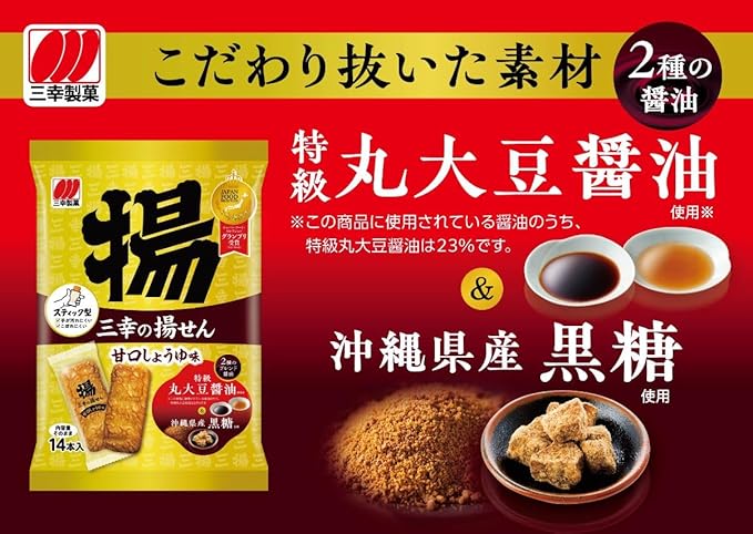 揚げせんべいの新定番!本格的な揚げせんべいのおいしさを、手に優しく、食べこぼしにくい個包装でお楽しみいただけます。香味油をベースに、厳選した本醤油をはじめとした2種類の醤油と沖縄産黒糖をブレンドした醤油で味付け。醤油の旨みと黒糖の甘みが絶妙にマッチした、やみつきになる味わいです。