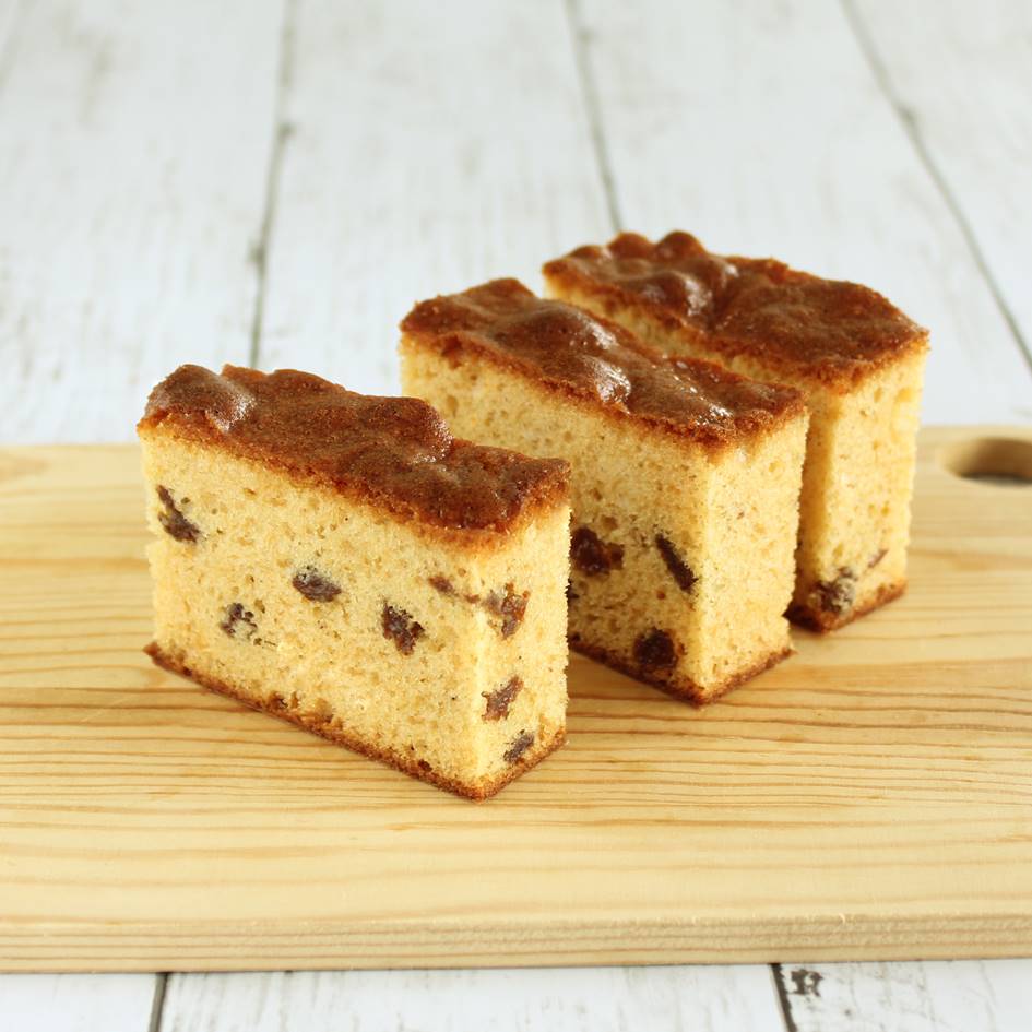 洋酒漬けレーズンをふりかけ、しっとり柔らかく焼き上げました。