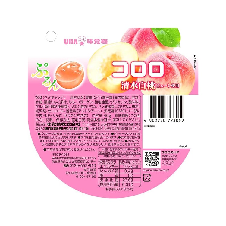 コロロは独自の製法と外側のコラーゲンで独特の食感を生みだしています。ぶどう果汁を使用することで、まるで桃そのものを食べているかのような、コロロでしか味わえないジューシーでフルーティーな味わいに仕上げています。