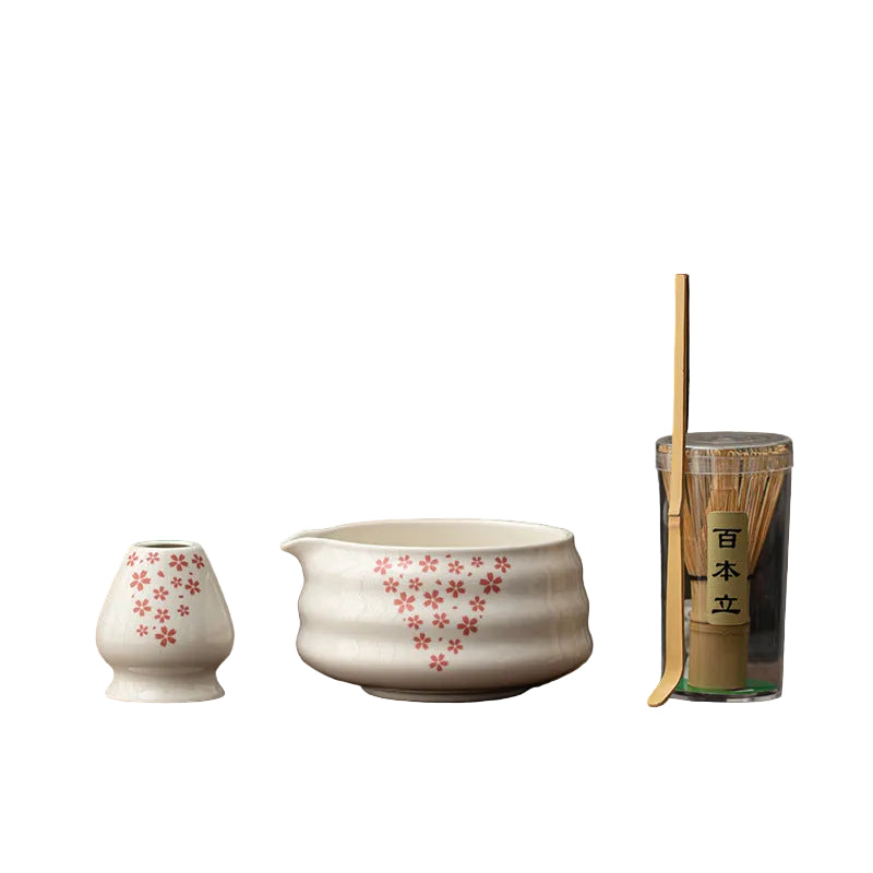 The matcha whisk set has 1 x 100 prongs whisk, 1 x bamboo whisk holder, 1 x bamboo scoop, 1 x ceramic matcha bowl.