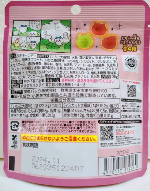 Starch syrup (produced in Japan), sugar, gelatin, white bean paste, powdered wafer, concentrated muscat juice, glutinous rice flour/sorbitol, glycerin, powdered cellulose, thickening polysaccharides, acidulant, flavoring, glossing agent, mannitol, coloring (red yeast rice, safflower yellow, gardenia), emulsifier