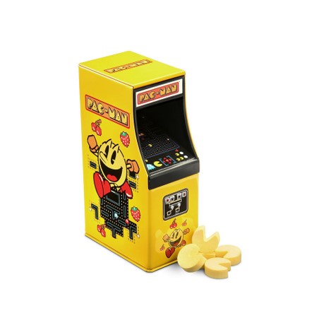 The official 80s arcade graphics! Each tin is shaped like the arcade cabinet and holds 0.6 ounces of strawberry flavored Pac-Man shaped candies.