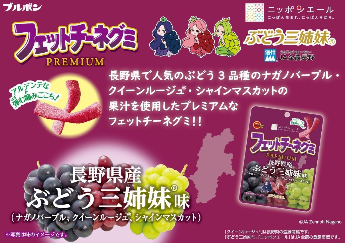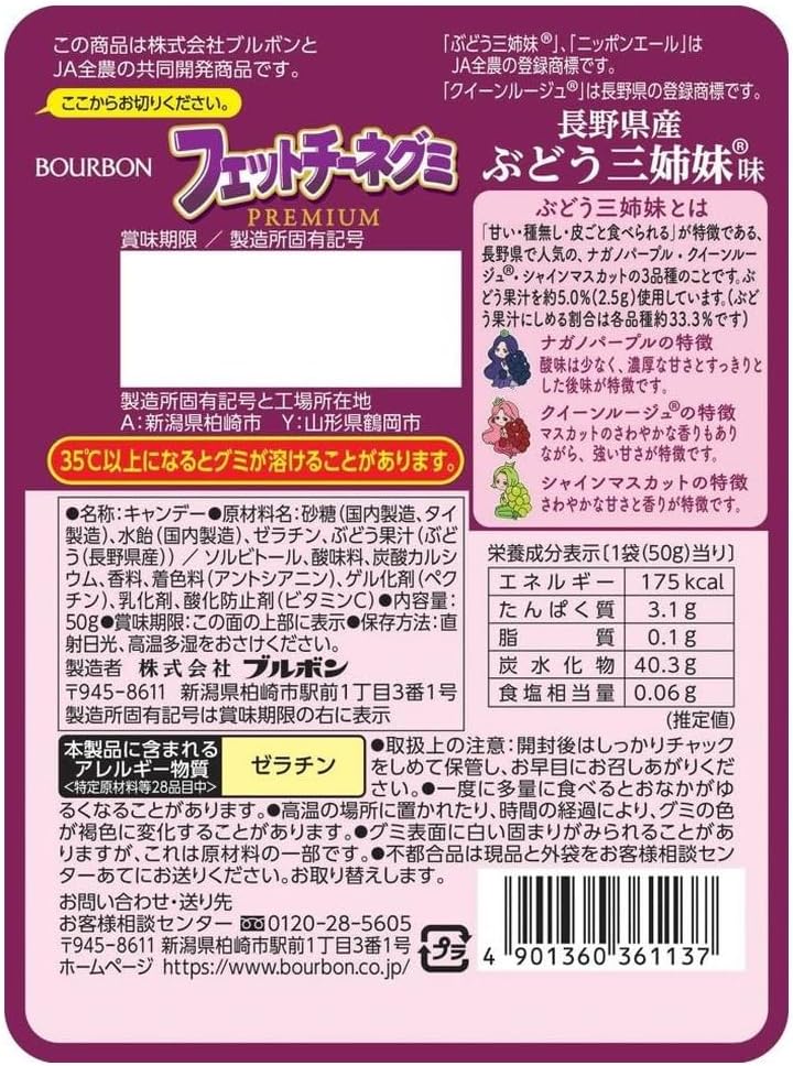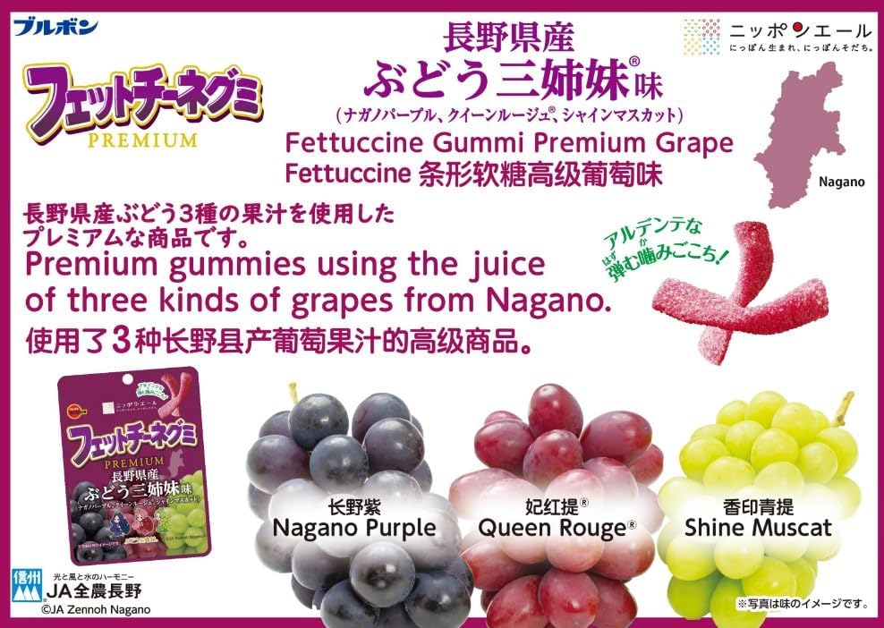 Sugar (Japan and Thai), starch syrup (Japan), gelatin, grape juice (grapes (Nagano Prefecture)), sorbitol, acidulant, calcium carbonate, flavoring, coloring (anthocyanin), gelling agent (pectin), emulsifier, antioxidant (vitamin C)