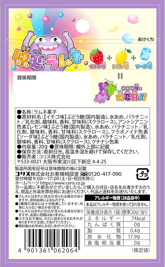 It's delicious whether you eat them individually or all three together, so you can enjoy the different flavors. There are four flavors in total: lemon, soda, strawberry, and (when combined) grape.