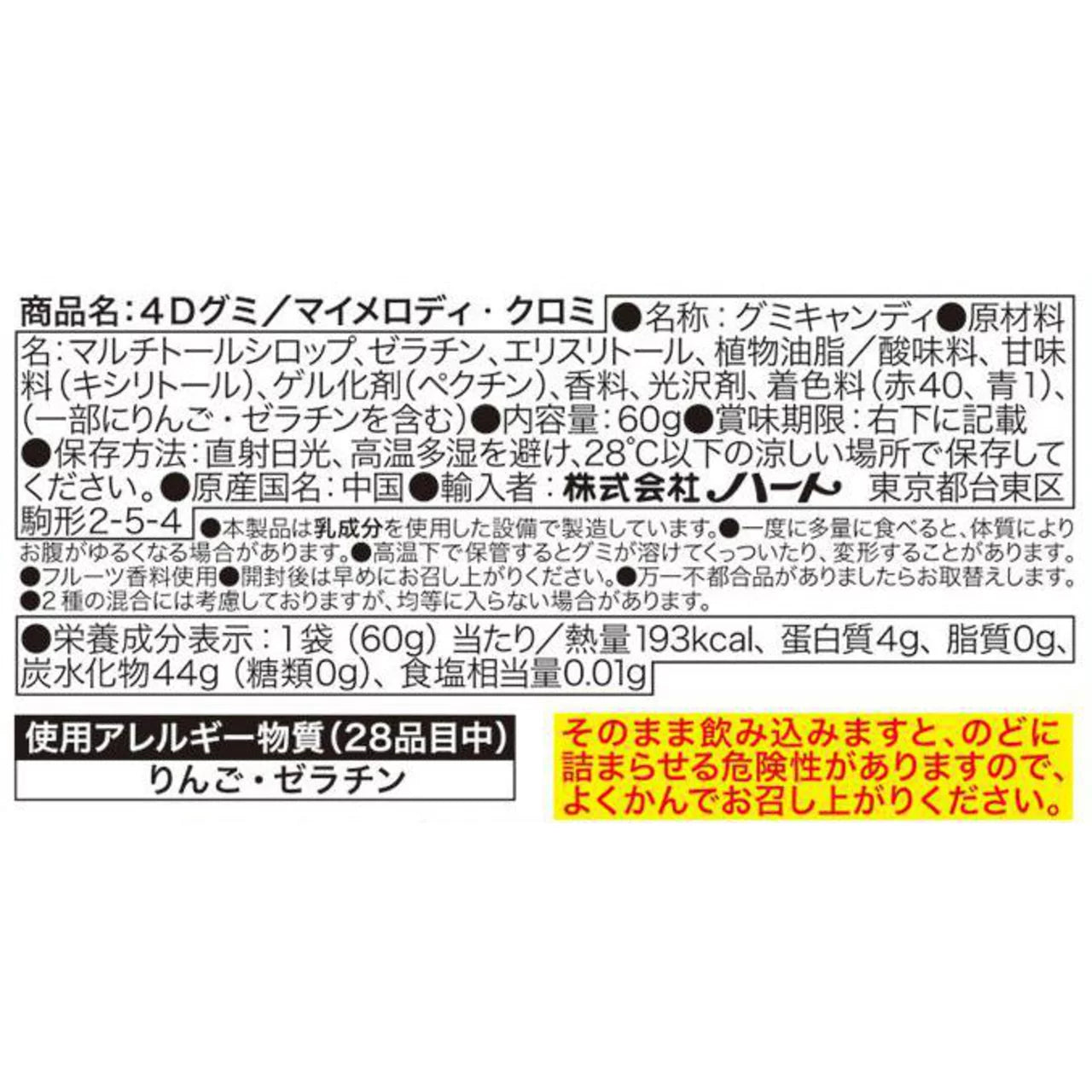 When you stick the two gummies together, you'll get a design of My Melody and Kuromi holding a heart together!1 Their flavors are apple and grape.