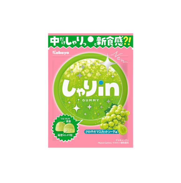 Kabaya's unique "Inner Crunchy Method" seals the "secret rice grains" inside, making these gummies smooth on the outside, but with a unique, crunchy texture the moment you bite into them. They come in a refreshing Muscat Soda flavor.