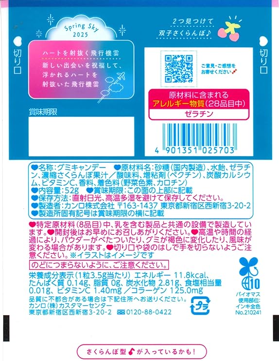 Sugar (made in Japan), starch syrup, gelatin, concentrated cherry juice/acidulant, thickener (pectin), calcium carbonate, vitamin C, flavoring, coloring (vegetable pigment, carotene)