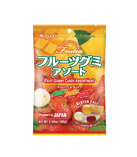 GLUCOSE SYRUP, SUGAR, SORBITOL, GELATIN, CONCENTRATED APPLE JUICE, MANGO JUICE, CONCENTRATED STRAWBERRY JUICE, CITRIC ACID, PECTIN, MALIC ACID, NATURAL AND ARTIFICIAL FLAVOR, STARCH POWDER (POTATO), CONCENTRATED LYCHEE JUICE, SODIUM CITRATE, EMULSIFIERS [POLYGLYCEROL ESTERS OF FATTY ACIDS, ENZYME-MODIFIED LECITHIN (SOYBEANS)], CARNAUBA WAX, BETA-CAROTENE, FD&C RED No.40.