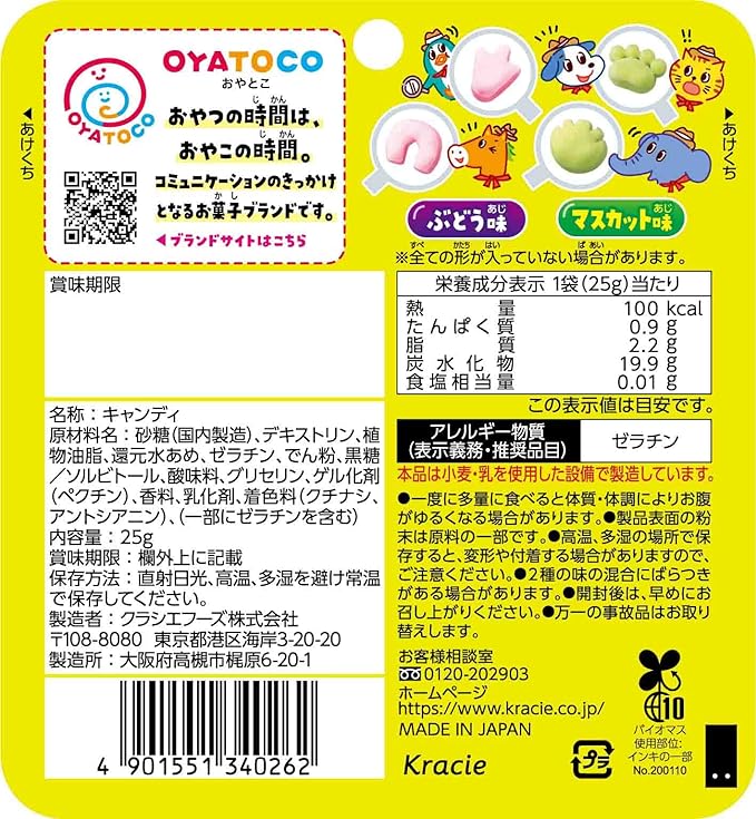 Sugar (manufactured in Japan), dextrin, vegetable oil, reduced starch syrup, gelatin, starch, brown sugar/sorbitol, acidulant, glycerin, gelling agent (pectin), fragrance, emulsifier, coloring agent (gardenia, anthocyanin).