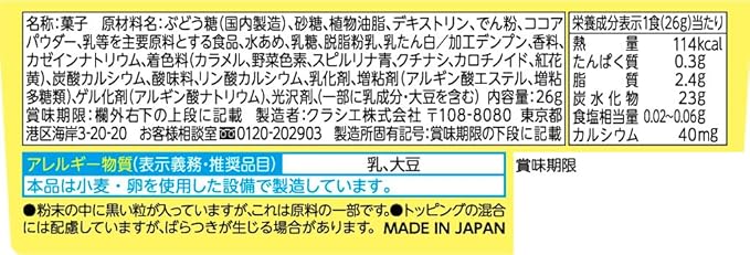 Glucose (produced in Japan), sugar, vegetable fats and oils, dextrin, starch, cocoa powder, foods with milk as the main ingredient, starch syrup, lactose, skimmed milk powder, milk protein/modified starch, flavoring, sodium caseinate, coloring (caramel, vegetable coloring, spirulina blue, gardenia, carotenoid, safflower yellow), calcium carbonate, acidulant, calcium phosphate, emulsifier, thickener (alginate ester, thickening polysaccharide), gelling agent (sodium alginate), glazing agent