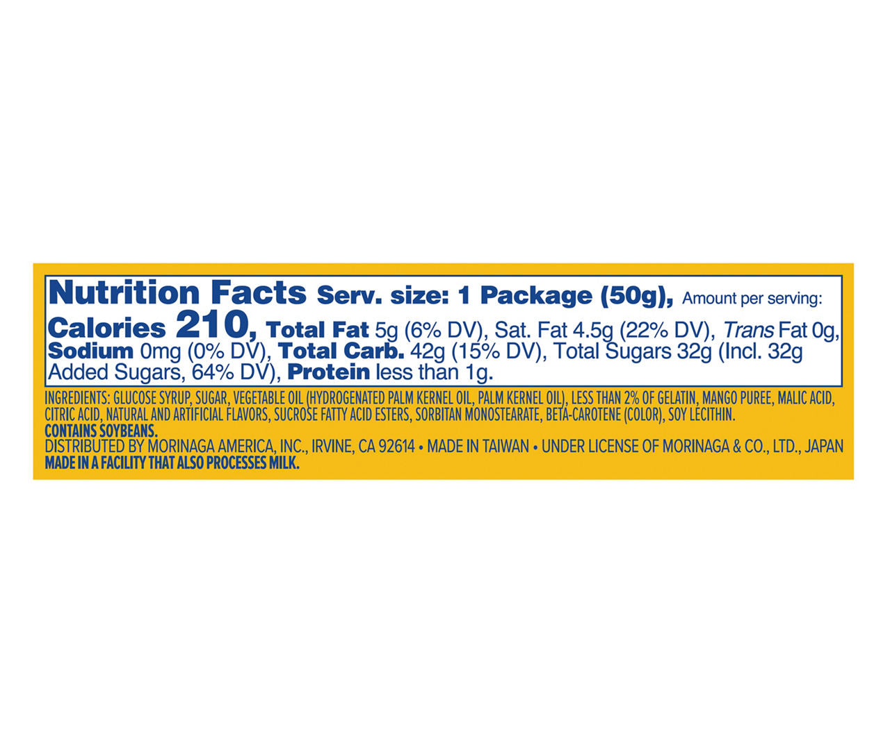 GLUCOSE SYRUP, SUGAR, VEGETABLE OIL (HYDROGENATED PALM KERNEL OIL, PALM KERNEL OIL), LESS THAN 2% OF GELATIN, MANGO PUREE, MALIC ACID, CITRIC ACID, NATURAL AND ARTIFICIAL FLAVORS, SUCROSE FATTY ACID ESTERS, SORBITAN MONOSTEARATE, BETA-CAROTENE (COLOR), SOY LECITHIN.