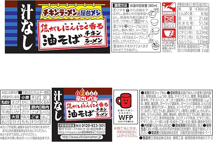 vegetable oil, soy sauce, salt, chicken extract, sugars, flavor seasonings, spices, dextrin, onion seasoning), sauce (vegetable oil, soy sauce, sugars, brewed vinegar, garlic seasoning, garlic seasoning oil, protein hydrolysate, yeast powder, flavor oil, bamboo shoot powder), toppings (red chili pepper, green onion) / modified starch, seasonings (monosodium glutamate, etc.), calcium carbonate, alkaline water, flavoring, caramel color, alcohol, acidulant, thickener (modified starch), antioxidant (vitamin E), spice extract, carotenoid color, vitamin B2, vitamin B1