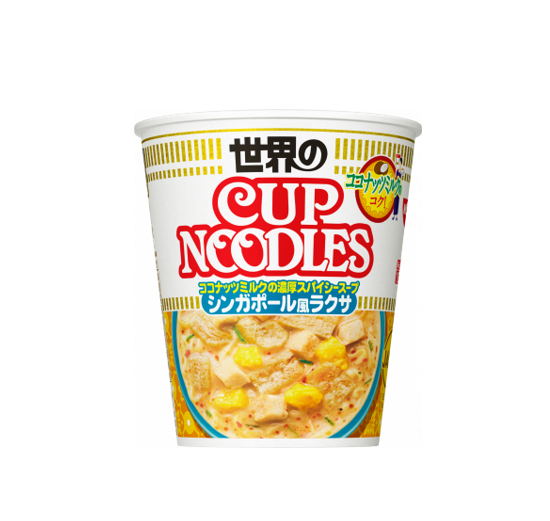 Fried noodles (wheat flour (produced in Japan), vegetable oil, salt, protein hydrolysate, soy sauce, spices, flavor seasonings), soup (foods mainly made from milk, sugar, laksa paste, salt, lard, coconut milk powder, spices), toppings (seasoned minced chicken, seasoned fried tofu, seasoned egg, red chili pepper, coriander) / processed starch, seasonings (monosodium glutamate, etc.), thickening polysaccharides, calcium carbonate, acidulant, kansui, caramel color, flavoring, emulsifier, carotenoid color, antioxidant (vitamin E), sweetener (sucralose), liquid smoke, vitamin B2, silicone, sodium carbonate, vitamin B1, spice extract