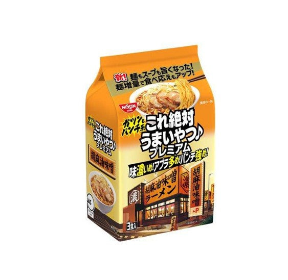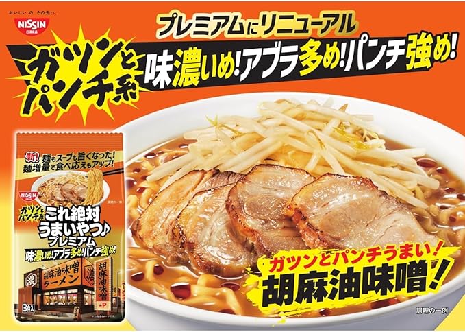 Noodles (wheat flour (produced in Japan), salt, vegetable oil, egg powder, chicken seasoning, soybean dietary fiber), soup (miso, soy sauce, lard, pork extract, sugars, spices (garlic, ginger, pepper), salt, vegetable oil, yeast extract, flavoring oil) / modified starch, seasoning (monosodium glutamate, etc.), salt water, calcium phosphate, caramel pigment, fragrance, spice extract, carotenoid pigment, antioxidant (vitamin E), emulsifier, vitamin B2 , Vitamin B1