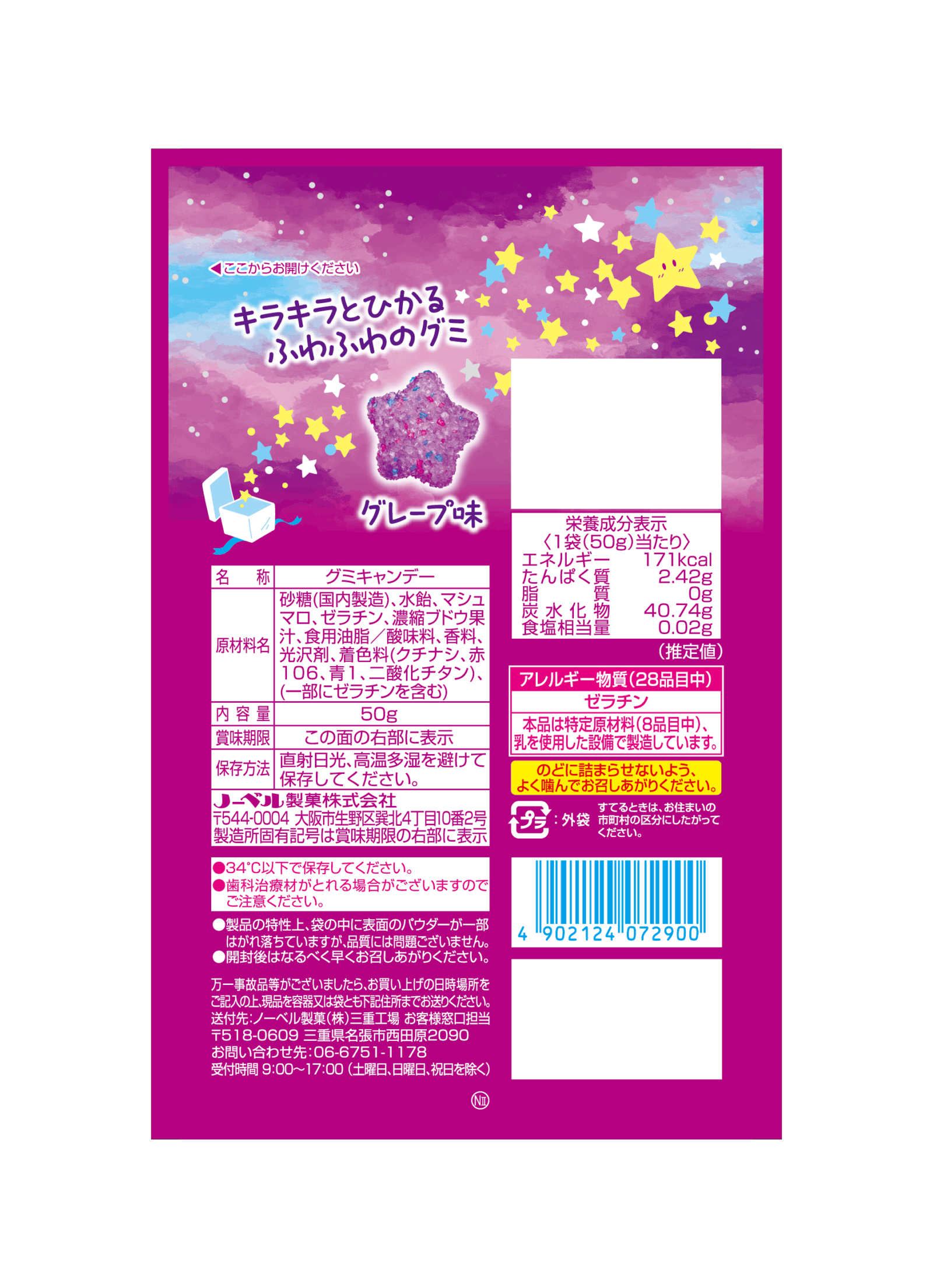 Sugar (produced in Japan), starch syrup, marshmallows, gelatin, concentrated grape juice, edible oils and fats/acidifier, flavoring, glazing agent, coloring (gardenia, red 106, blue 1, titanium dioxide)