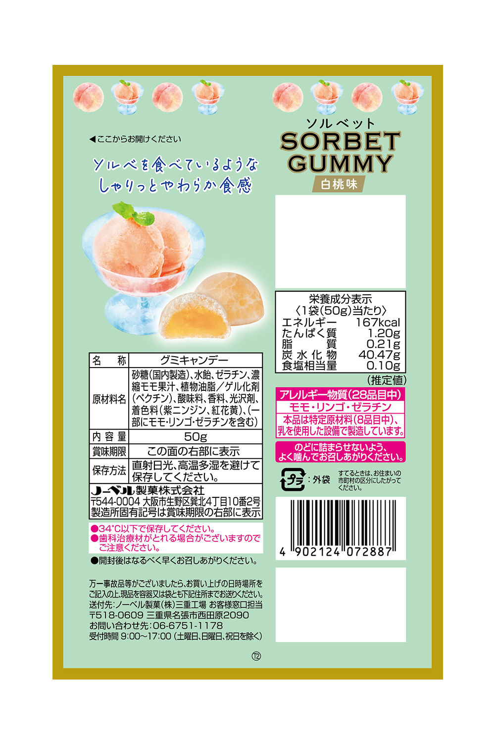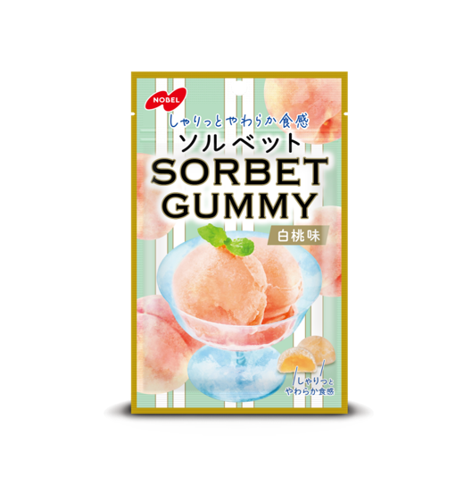 These gummy candies have a new texture with a soft and crunchy white peach flavor that makes you feel like you're eating sorbet.