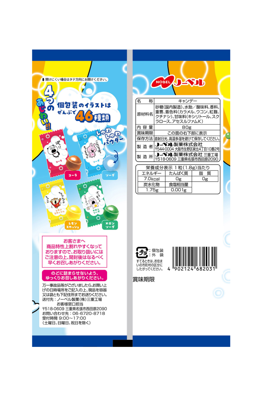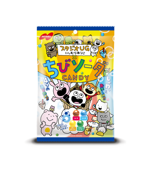 Introducing a new soda candy with a lively and fun worldview featuring the friends of "Studio UG" by popular creator Nishimura Yuji! Enjoy the four flavors of cola, soda, lemon squash, and melon soda with fizzy powder in the center