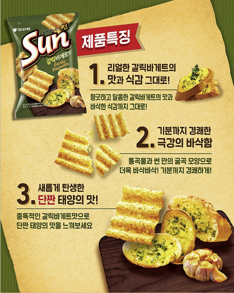 Korean sun chip with garlic baguette flavour.