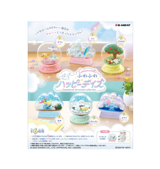 Collect all 6 Re-Ment Cinnamoroll Terrarium Collection. These are mystery boxes, if you purchase 1 single box, it'll be a random pick. If you purchased the entire set, you'll be able to collect all 6 Re-Ment Cinnamoroll Terrarium Collection.