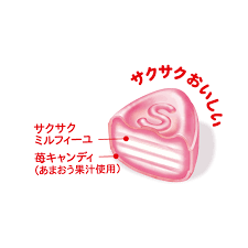 This long-selling product, launched in 1970, is a crunchy milk mille-feuille wrapped in milky pink strawberry candy. Made with the juice of Amaou strawberries from Fukuoka Prefecture, the "king of strawberries," enjoy the harmony of the sourness of the strawberries and the milk. There's a little secret hidden within the strawberry pattern on the wrapper. Please pay attention to the shape of the strawberries and the pattern.