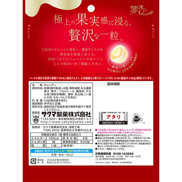 Sugar (made in Japan), starch syrup, vegetable oil, concentrated peach juice, agar/sorbitol, acidulant, gelling agent (thickening polysaccharide), flavoring, emulsifier