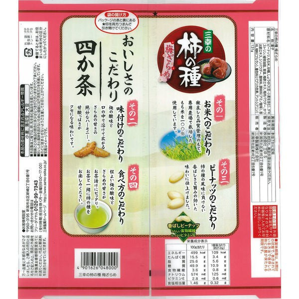 Peanuts (from China), glutinous rice, sugar, soy sauce (contains wheat and soybeans), dextrin, vegetable oil, salt, plum paste, dried bonito extract, plum meat powder (95% Nanko plum from Kishu) / acidulant, Fragrance, seasoning (monosodium glutamate, etc.), paste (pullulan), coloring (paprika pigment, anthocyanin, red beet)