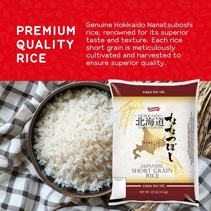 Nanatsuboshi rice is a high-grade Hokkaido grown shot-grain rice that has light, crispy taste, soft texture, and moderate flavour.
