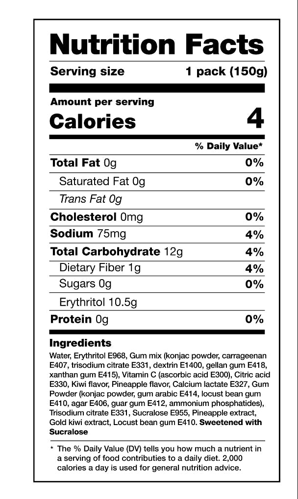Water, Erythritol E968, Gum mix (konjac powder, carrageenan E407, trisodium citrate E331, dextrin E1400, gellan gum E418, xanthan gum E415), Vitamin C (ascorbic acid E300), Citric acid E330, Kiwi flavor, Pineapple flavor, Calcium lactate E327, Gum Powder (konjac powder, gum arabic E414, locust bean gum E410, agar E406, guar gum E412, ammonium phosphatides), Trisodium citrate E331, Sucralose E955, Pineapple extract, Gold kiwi extract, Locust bean gum E410. Sweetened with Sucralose