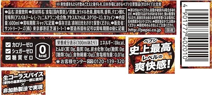 Salt (produced in Japan)/carbonic acid, caramel color, acidulant, flavoring, potassium citric acid, sweetener (aspartame/L-phenylalanine compound, acesulfame K, sucralose), caffeine
