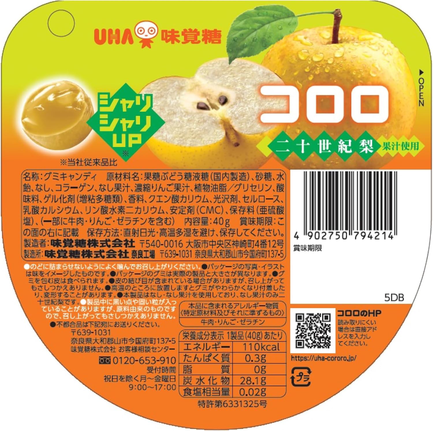 High fructose corn syrup (produced in Japan), sugar, starch syrup, pear, collagen, pear juice, concentrated apple juice, vegetable oil/glycerin, acidulant, gelling agent (thickening polysaccharide), flavoring, potassium citrate, glazing agent, cellulose, calcium lactate, dipotassium hydrogen phosphate, stabilizer (CMC), preservative (sulfite)