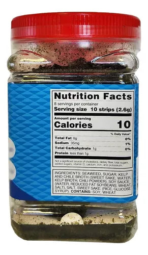Seaweed, Sugar, Kelp and Chili Broth (Sweet sake, Water, Kelp Broth, Chili Powder), Soy Sauce (Water, Reduced Fat Soybeans, Wheat, Salt) Salt, Sweet Sake (Rice, Glucose Syrup).